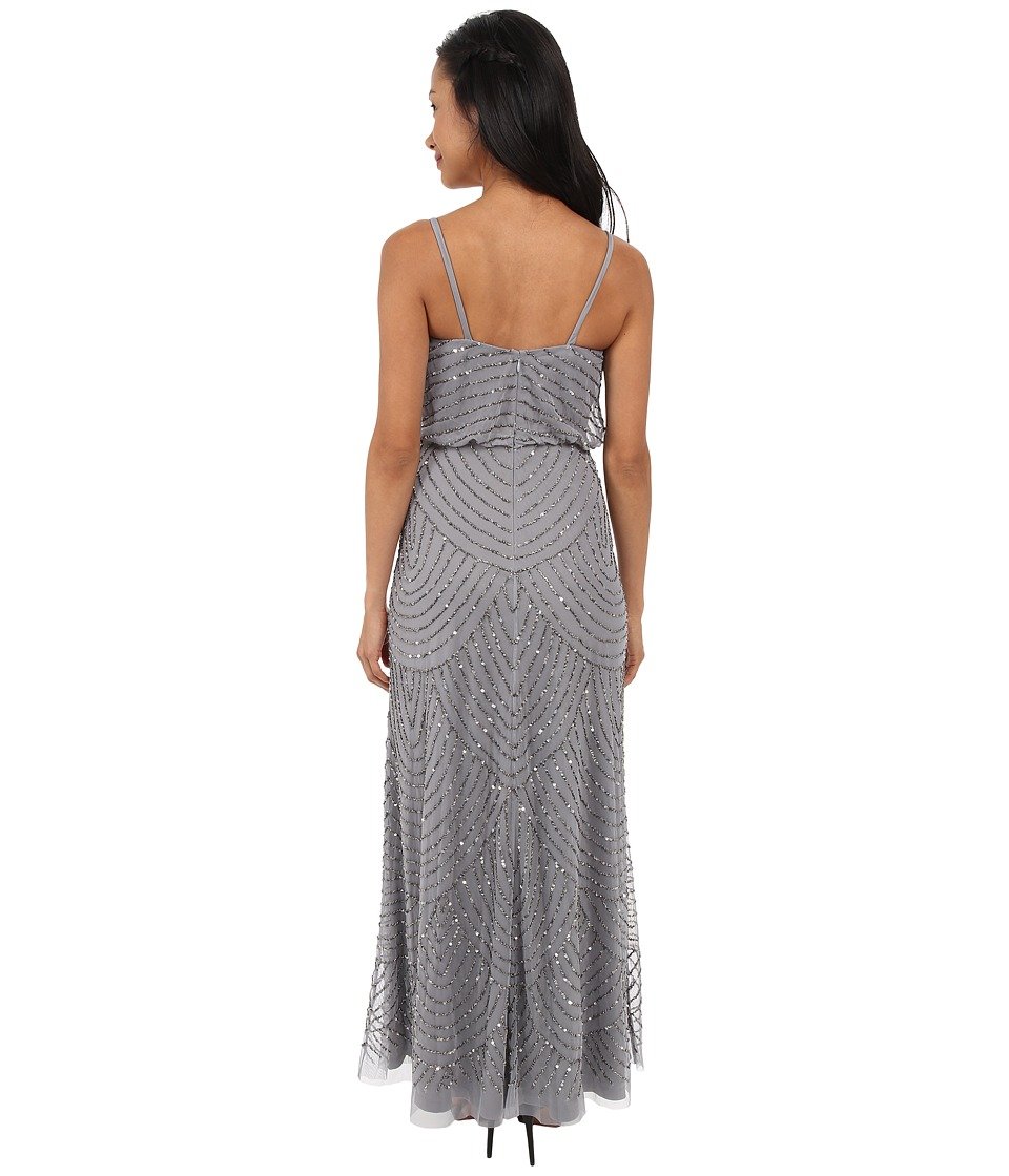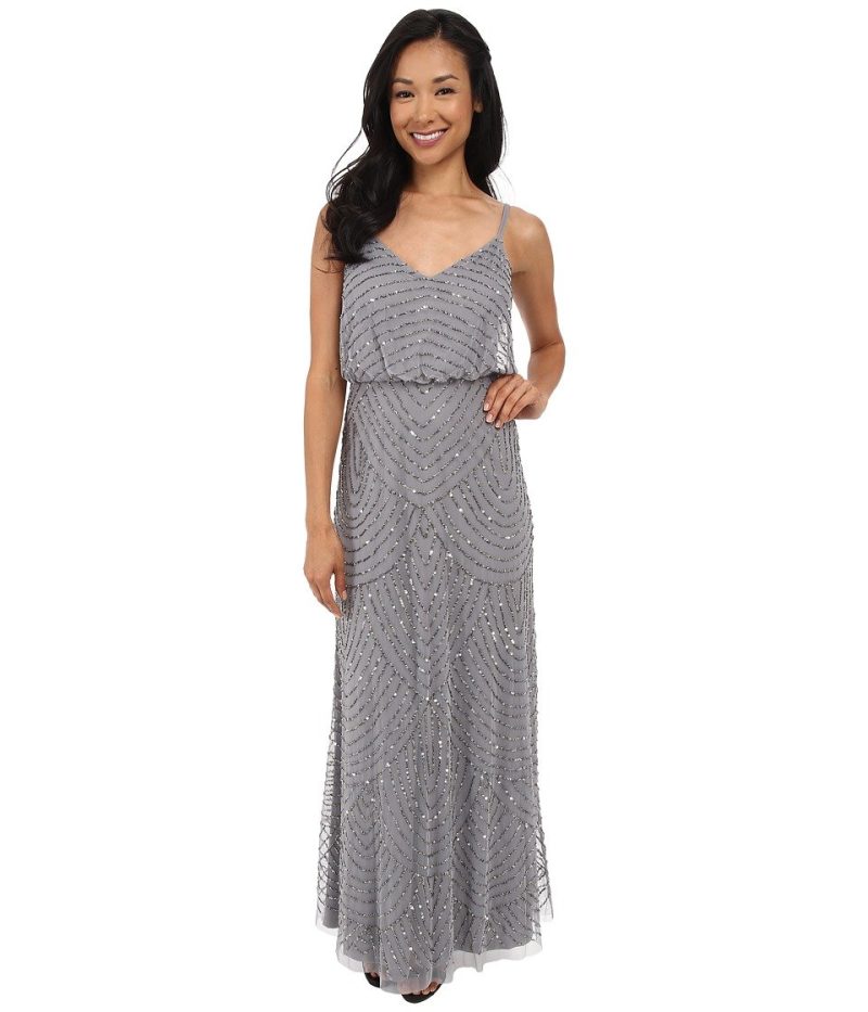 Imagine an evening where the room glows with soft lighting and the air hums with the sound of live music. This slate-grey gown, with its delicate spaghetti straps and relaxed blouson bodice, offers a balance of elegance and ease. The floor-length skirt is adorned with intricate beading in graceful, scalloped patterns that shimmer subtly as you move.