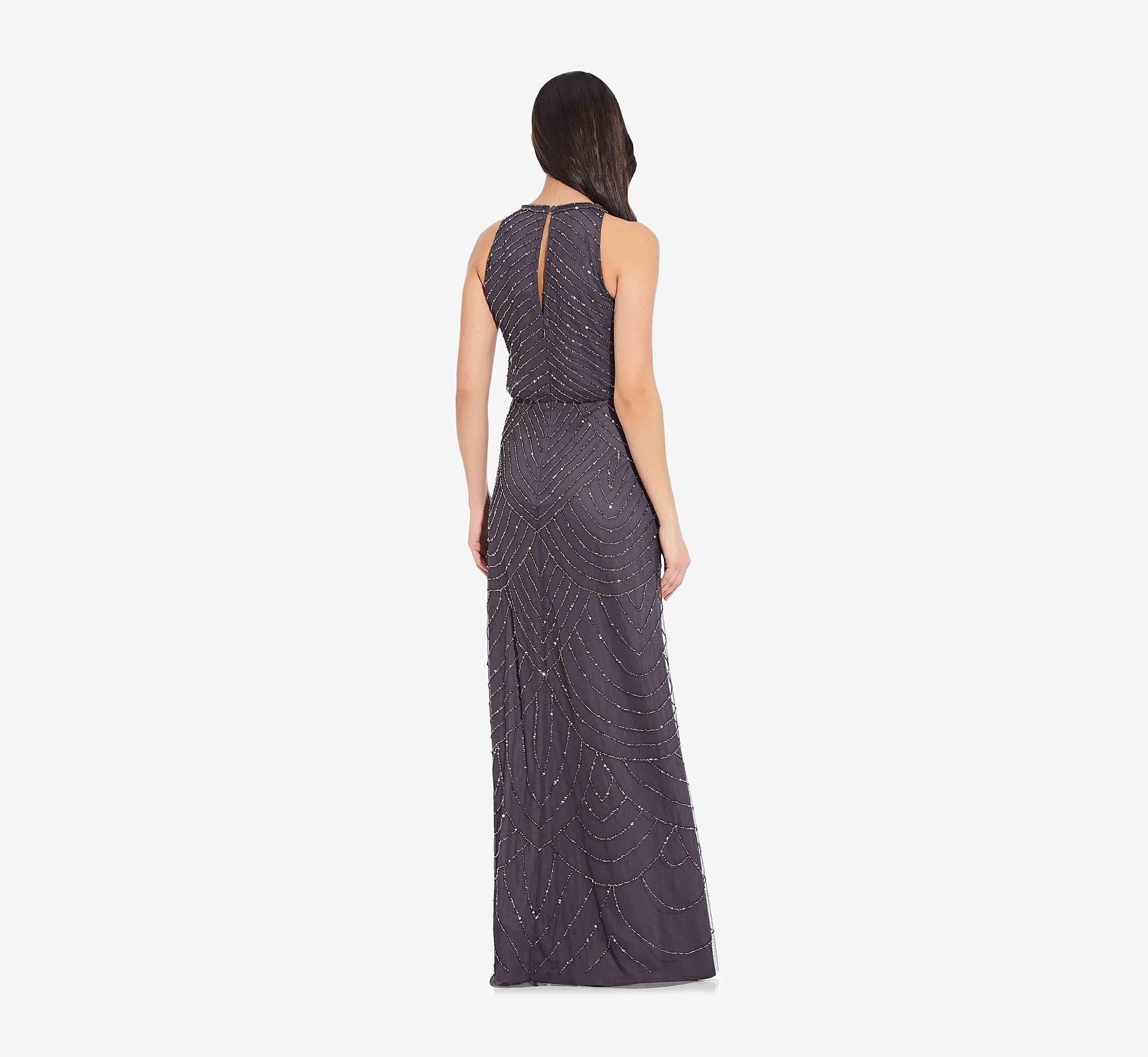 Imagine an elegant evening reception, where the light from chandeliers reflects softly across the room and the sound of gentle music fills the air. This slate-toned gown, with its high neckline and relaxed blouson bodice, drapes effortlessly for a refined yet comfortable fit. Intricate beadwork forms sweeping, scalloped patterns along the floor-length skirt, shimmering subtly with every movement.
