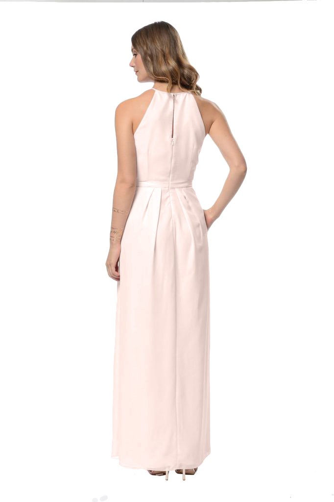 Imagine a serene afternoon wedding or a refined garden party, where the air feels light and the setting is touched with romance. This pale blush gown flows with graceful simplicity, its halter neckline softly gathering at the collar to frame the shoulders. The fitted waistband defines the silhouette, while the long, pleated skirt drapes elegantly to the floor — and discreet side pockets add a touch of modern practicality.